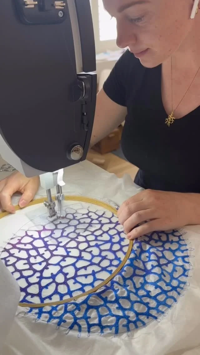 Her sculptural embroideries are an exploration of art, science and nature. The embroideries are created using a unique freehand embroidery technique that utilises a domestic sewing machine and a fabric that dissolves in water.