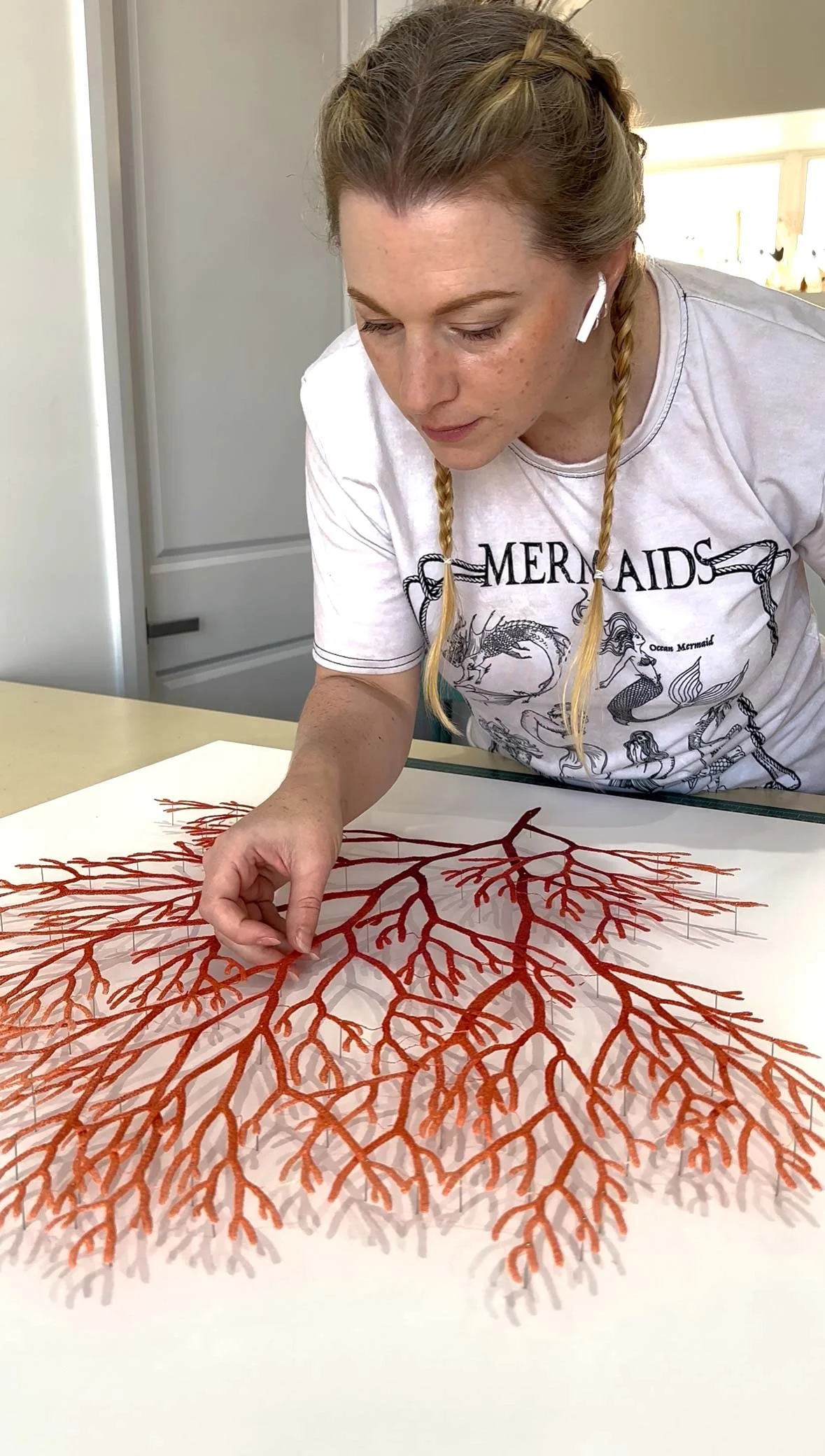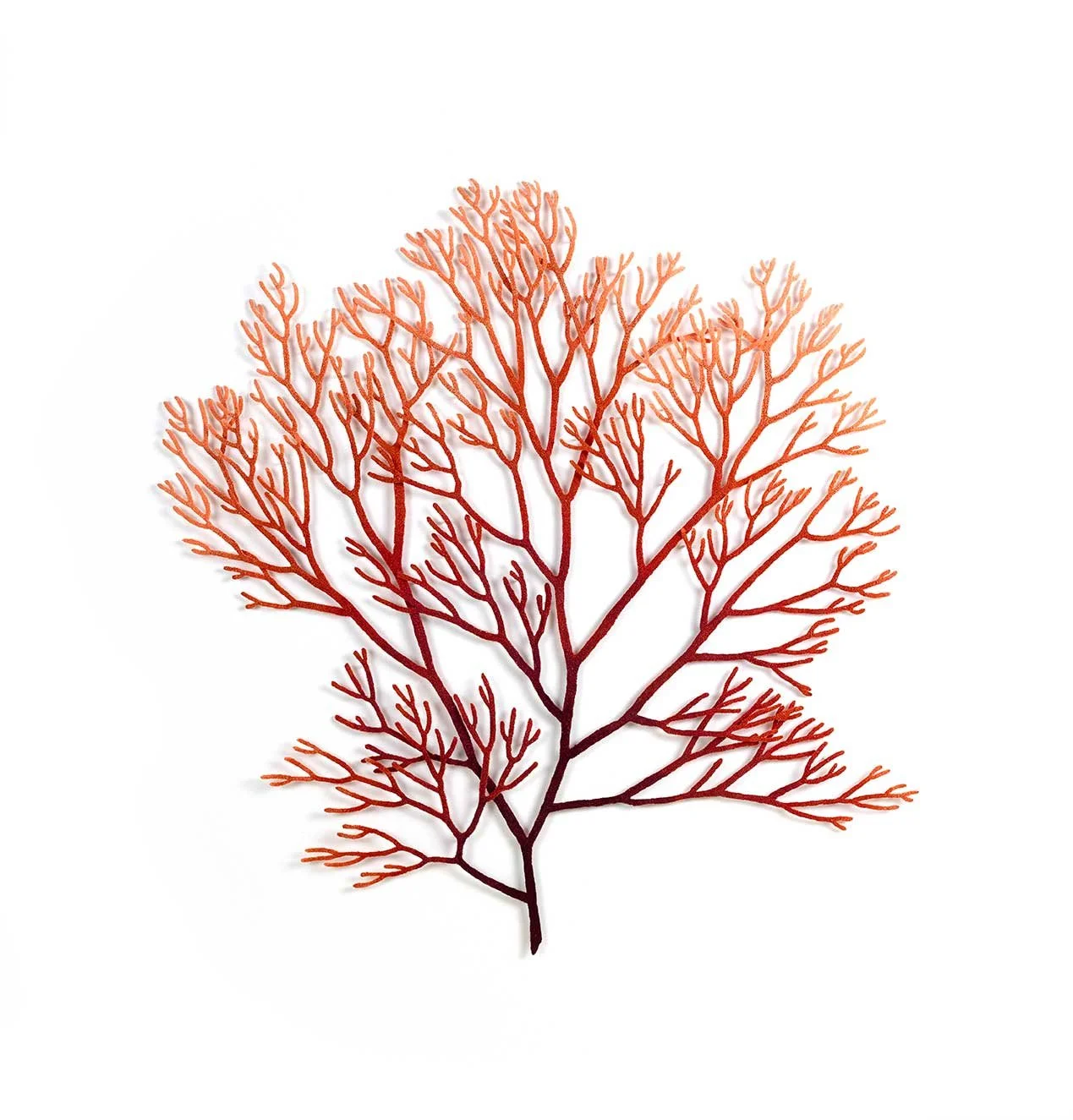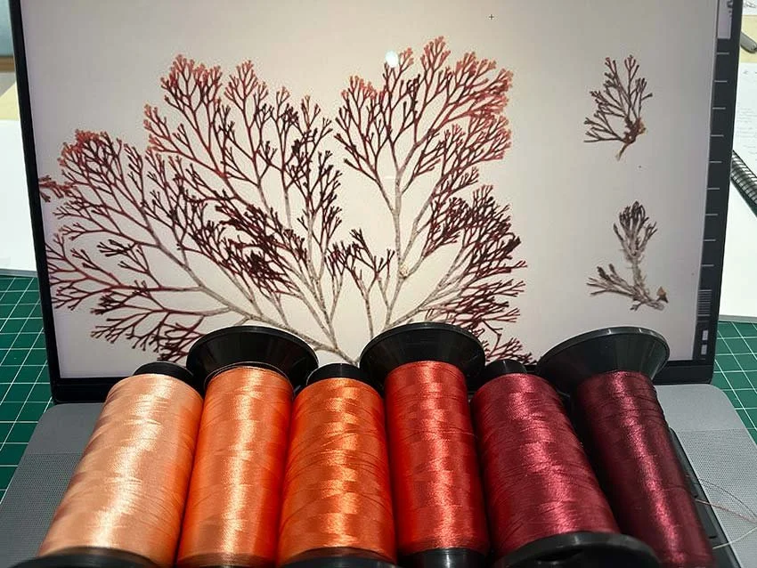 Sylvia had a few ideas to start with but we ended up focusing on a small but very beautiful seaweed species Laurencia elata. Sylvia had specifically researched this species and written several papers on this plant so it felt like the right one. Working from herbarium specimen imagery, I developed a design that enlarged this petite plant into an embroidered study focusing on it’s vibrant colours and delicate branching structure.