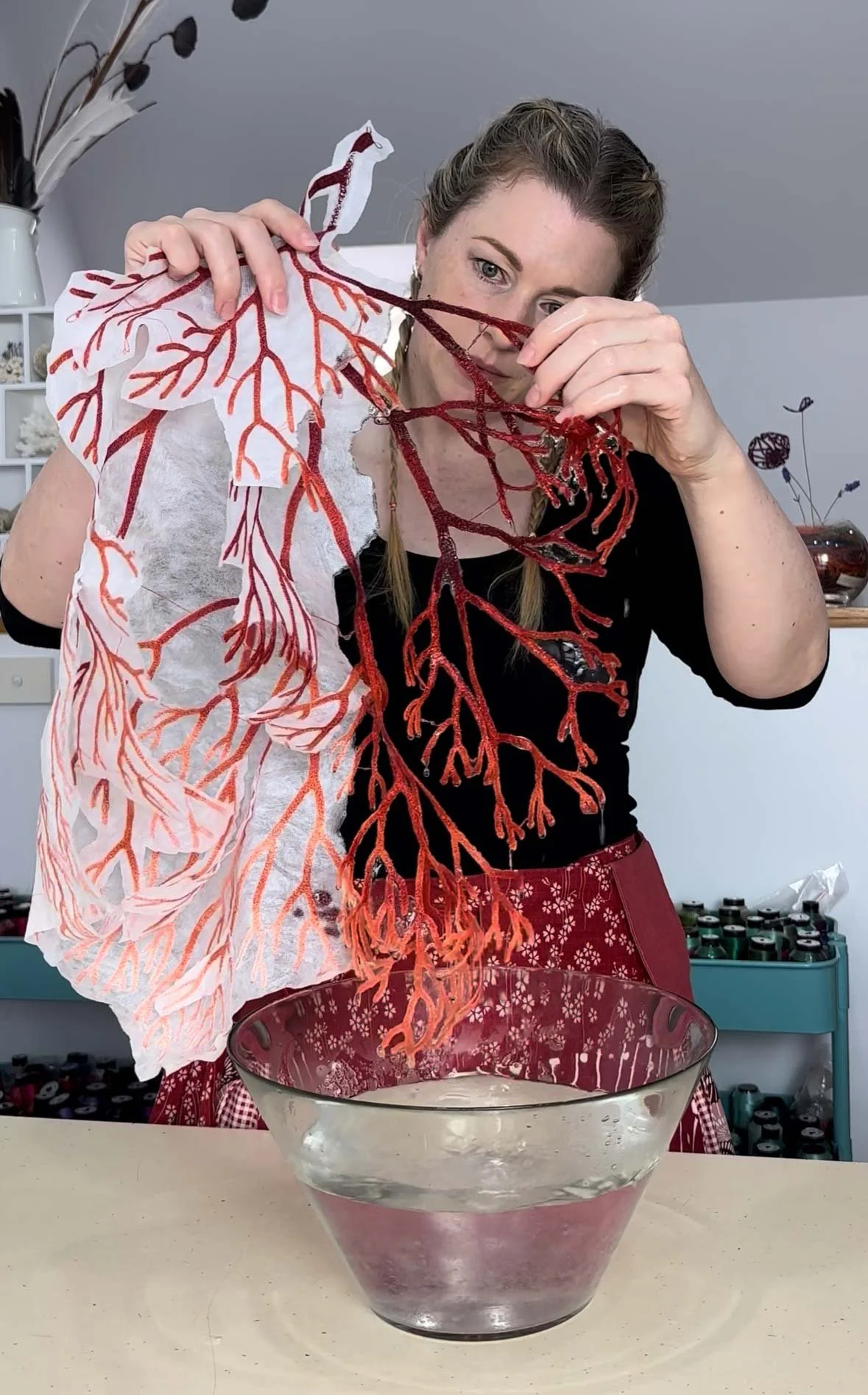 One element of this design with made it equally fun and challenging was the fact that many of the branches of the seaweed design I was making overlapped. This meant that I wasn’t able to stitch the design as a single piece, as I often do in my work, instead I had to stitch fourteen separate pieces then stitch them all together at the end prior to dissolving. It was super fiddly work but I was delighted with how it turned out.